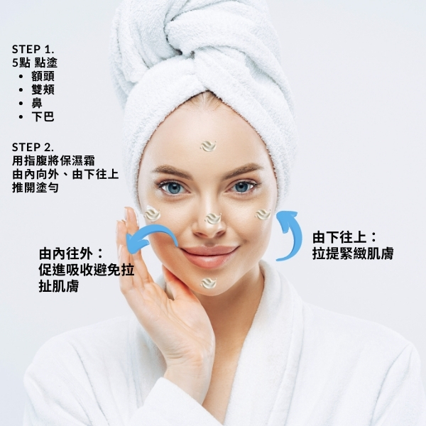 塗抹方法 | 均勻+不拉扯 | 五點點塗(額頭/雙頰/鼻/下巴)→ 用指腹將面霜由內向外、由下往上推開塗勻 |