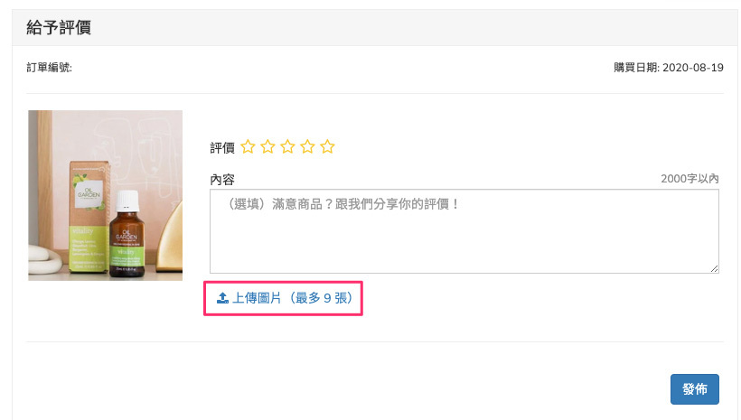 步驟3:可在此步驟上傳圖片,每個商品最多上傳 9 張評價圖片。
