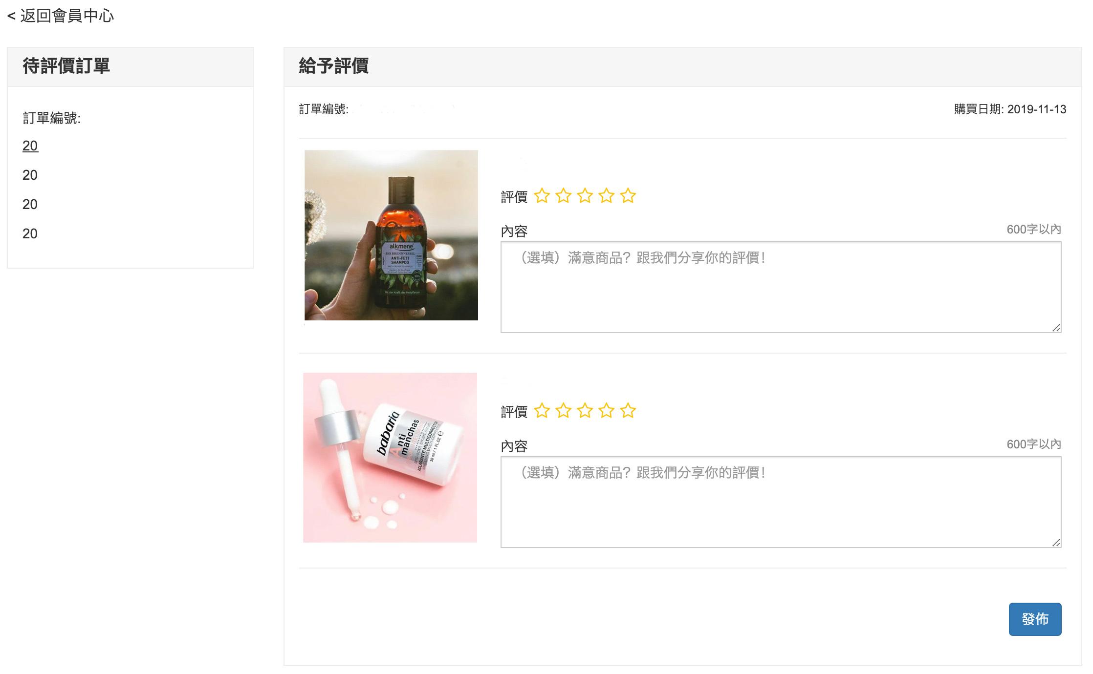 步驟2:點擊【馬上評價】按鈕進入評價頁面,點選想要評價的訂單,點亮星星為訂單中的每件商品評分(必填,最低分1星,滿分5星),填寫評論內容