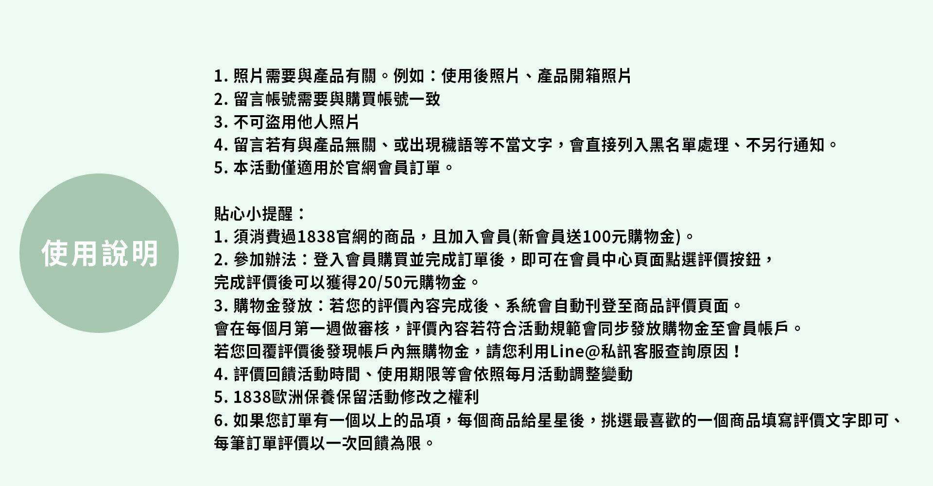 主辦單位(1838歐洲保養)對參加者提供之商品評價內容保有審查權、針對本活動內容保有解釋權。若參加者評價內容不符活動相關規定,得取消得獎資格、不另行通知。
