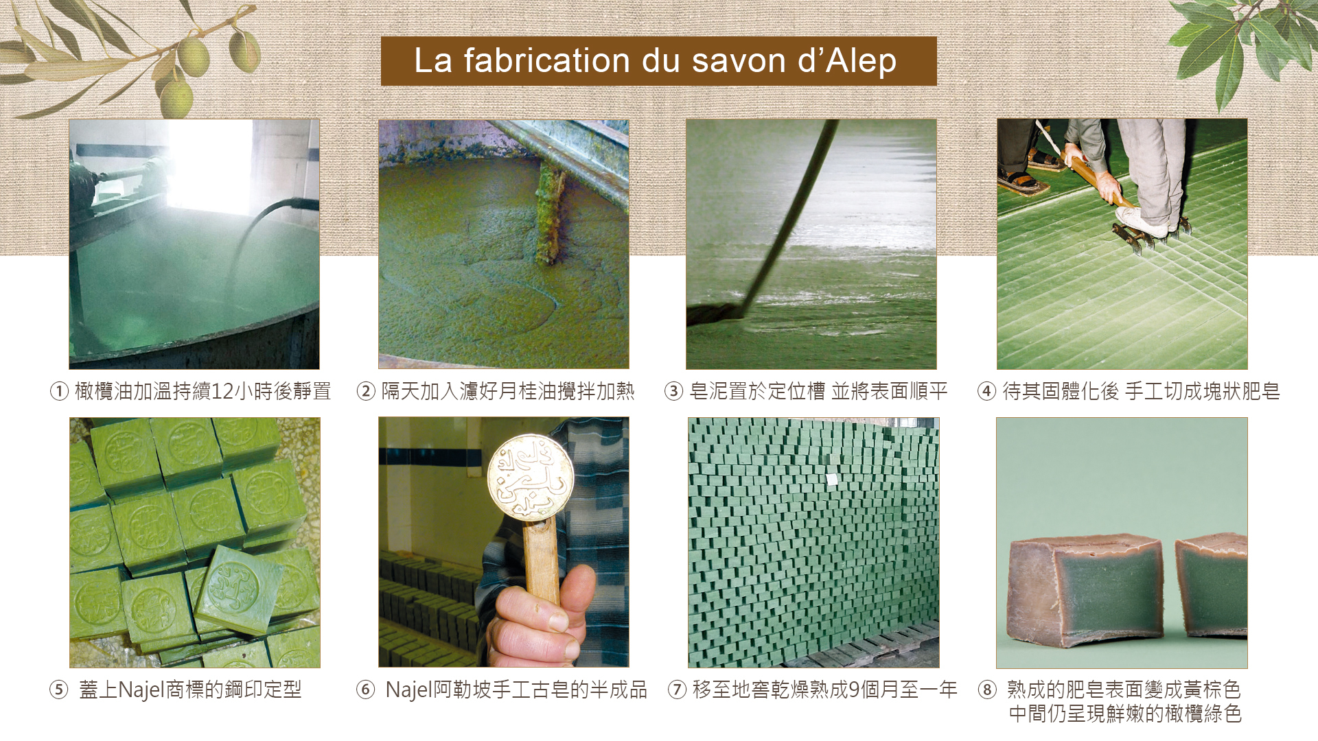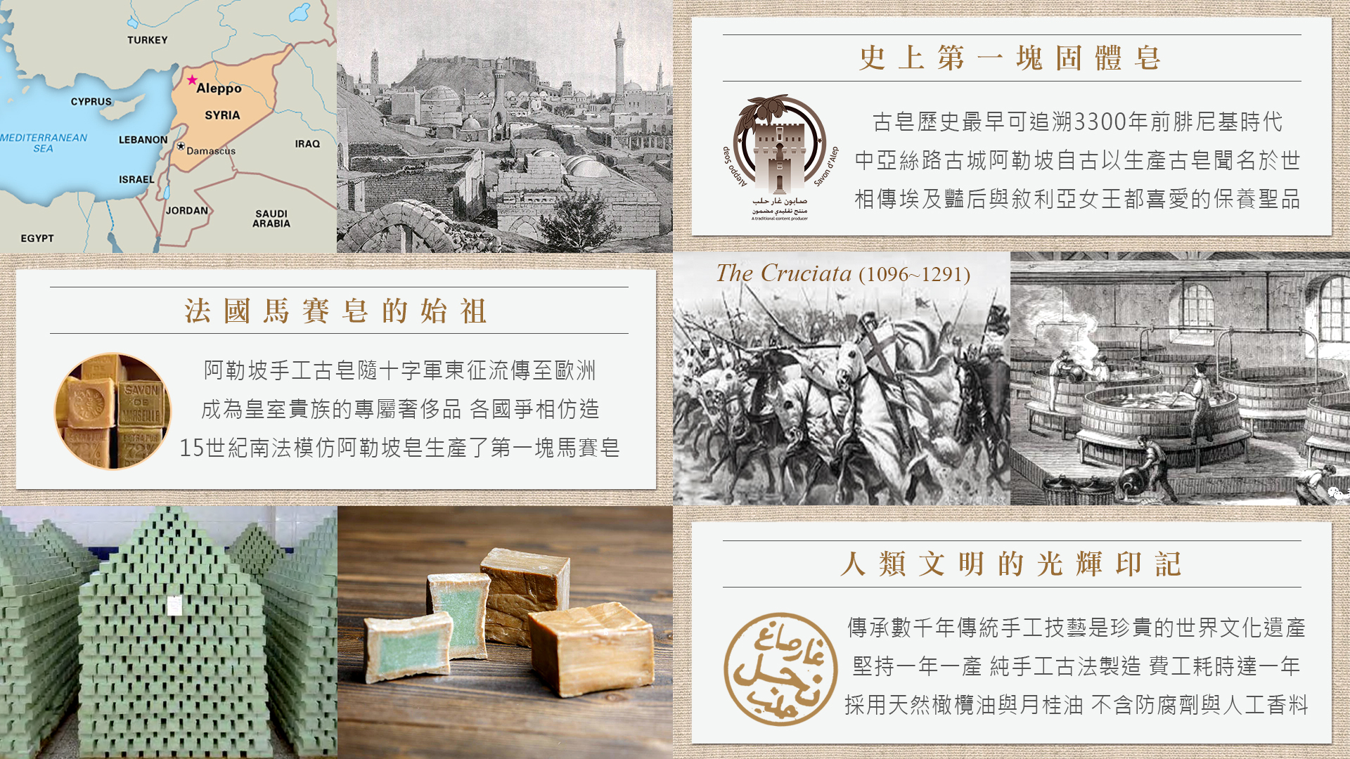 阿勒坡傳統手工皂完全由橄欖油和月桂油製成,是馬賽肥皂的祖先。在每年從11月底到3月底,遵循古老製程逐步製皂。