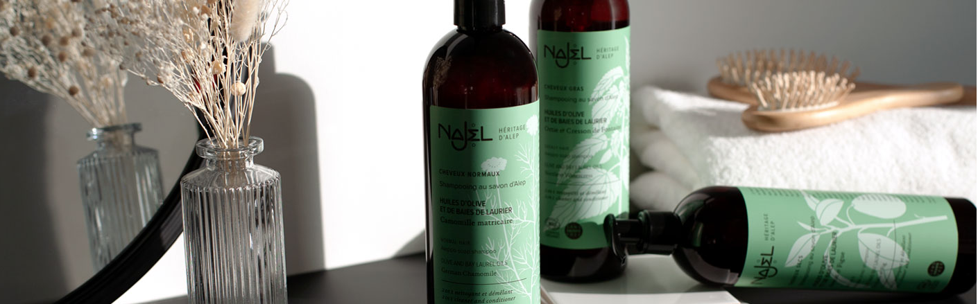 從NAJEL經典3大成分配製並點綴植物活性成分的NAJEL洗髮精、沐浴露、護髮膜產品裡、選擇適合您髮質與肌膚類型的產品。