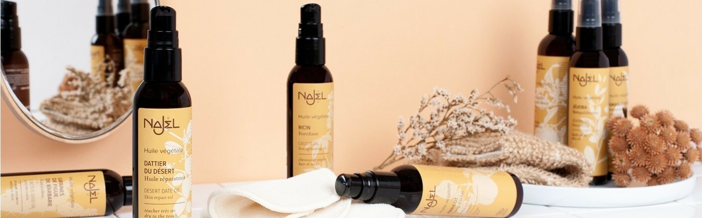 NAJEL 天然植物護理油對肌膚具有獨特而有益的特性, 是100% 天然、利用冷壓法提取自植物的果實、根部或種子的植物油,能夠完整的護理臉部、身體、指甲和頭髮保濕保養油品,它能使肌膚柔軟有彈性。